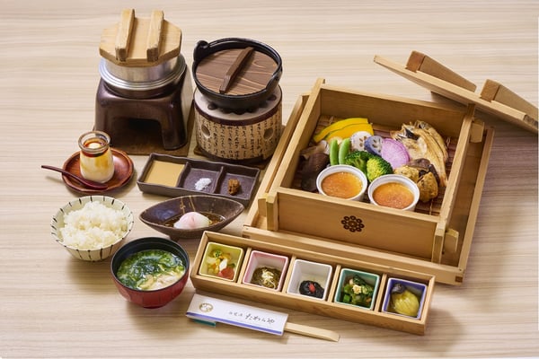 朝食は加賀の味覚を詰め込んだ和定食。旨味を閉じ込めるために丁寧に蒸し上げた野菜や多彩な味が楽しめる少量多品種の小鉢、源泉を使い食べる時間に合わせて炊き上げた釜炊きごはんなどが勢揃い。最後に味わうデザートは、「白鷺湯たわらや」特製の加賀棒茶プリン。味が気に入ったらフロント前にあるおみや処「おもいで」で購入もできますよ。