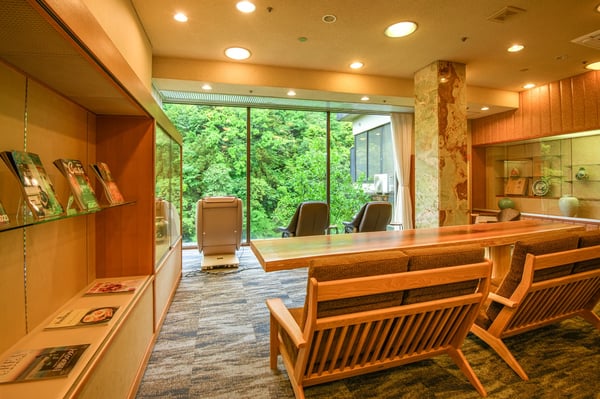豊かな自然が広がる5階のロビー。休憩スペースでフリードリンクを