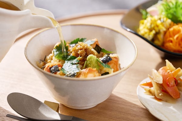 1階「OMOカフェ&バル」で味わえる「OMO5金沢片町 by 星野リゾート」の朝食は、その日の気分に合わせて選べる、美しく盛り付けられたワンプレート朝食で一日をスタート。メインは、ご当地風のお茶漬け、定番のアメリカンブレックファスト、濃厚な味わいのクロックムッシュなどからお選びいただけます。おすすめは、金沢らしい味として棒茶でいただく「棒茶茶漬け」をご用意。朝からしっかりパワーチャージして、金沢観光へ出かけましょう。