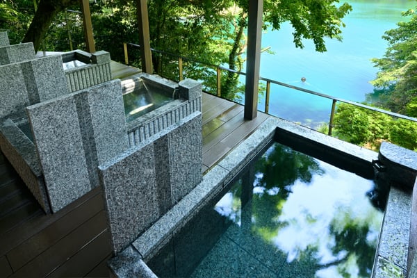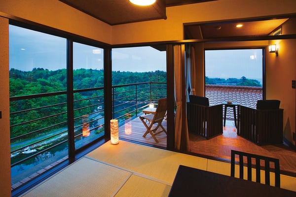 また、スタンダートの客室は、露天風呂付など3タイプから選べる「鶴齢」や細部までデザインにこだわりを魅せる和モダンの「游」、スタンダードな一般客室があります。どの客室にもテラスがあり美しい眺望を見渡せるのが人気。間取りを確認しながら、どのような時間が過ごせるのか、想像を膨らませながらチェックしてみましょう。