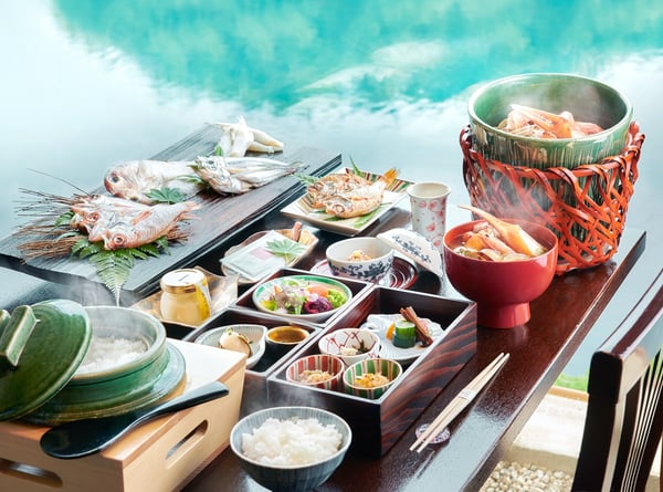 朝食は地元で獲れた新鮮な魚介、伝統野菜、能登牛などが贅沢に膳を彩ります。能登の海の幸・山の幸・野の幸が三位一体となったプレミアム朝食(事前予約)も選択できます。夕食と朝食の場所は、九十九湾の絶景を眺めながらゆったり料理が楽しめる個室食事処。昼夜で異なる表情を魅せる景観を望みながらダイニングのようなプライベート空間で美味を存分に味わえます。
