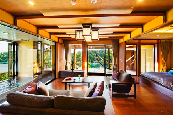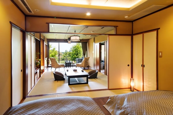 洋間と和室、テラスや露天風呂がシームレスにつながる百楽スイート「連理」