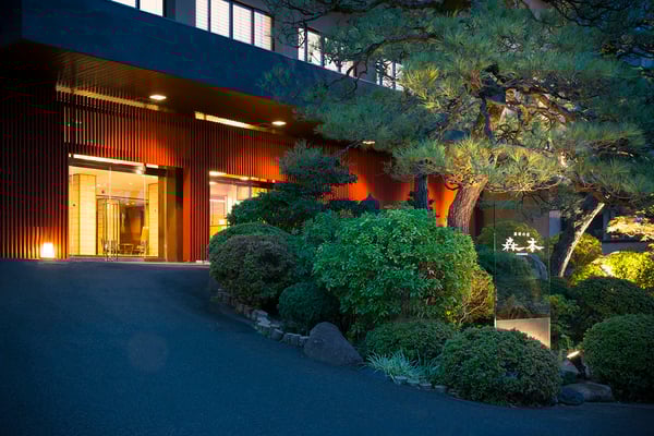 目の前に庭園が広がる、シックな佇まいの貸切風呂「九谷の湯」