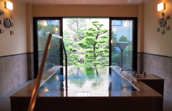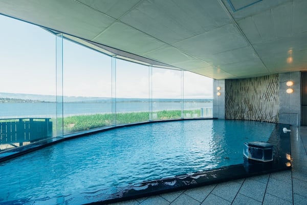 大浴場は男女ともに同じサイズで、湯船が広くのびのびと湯浴みが楽しめます。一面がガラス張りで、隣接の露天風呂と同様に美しい景観が一望できるので、朝食前や外出後に汗を流したり、食後や就寝前にカラダをしっかり温めたり、何度でもお楽しみください。
