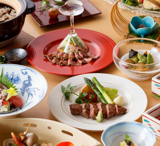 北陸ならではの海・山・大地の恵みが味わえる「湖畔の宿 森本」の夕食。特に能登牛認定店に指定されていることから、能登牛を使用したこだわりの料理が揃います。