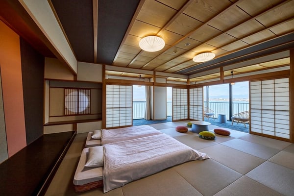 湖畔と浮御堂が一望できるベッドルームを備えた「和モダン客室」