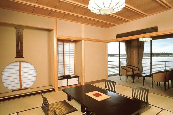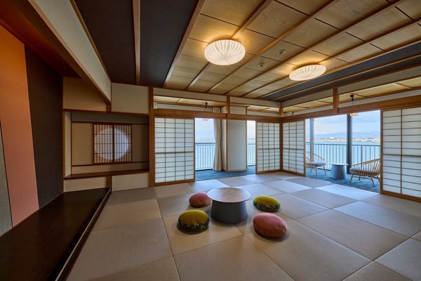 3タイプの新客室が誕生。そのうち2タイプは角部屋なので、琉球畳が敷かれた居室や2方向の窓から雄大な白山連峰と夕焼けや月明かりが湖畔に映る美しい景色が楽しめます。レイクビューの角部屋と基本客室もあるので、間取りや設えを確認しながらぴったりの客室をお選びください。