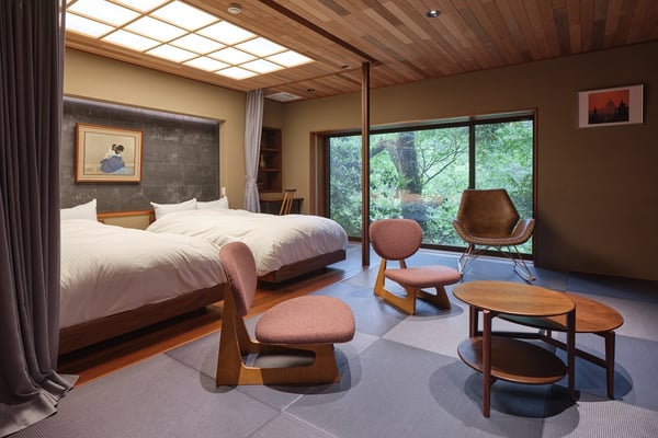 緑の庭を望む和の趣に包まれた、月の棟「露天風呂付き客室」(一例)