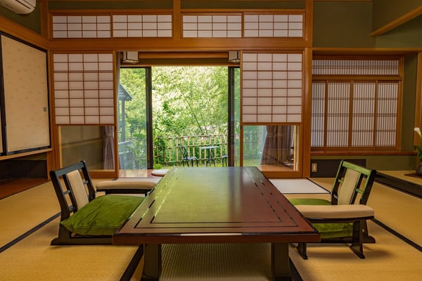 わずか7室の「胡蝶」は、全室が木造数寄屋造りで設えられ、落ち着きと温もりを併せ持つプライベート空間です。鶴仙渓に面した客室の窓を開ければ、清流のせせらぎが静かに響き、春は新緑、夏は深緑、秋は紅葉、冬は雪景色と、四季折々の風景が絵画のように広がります。