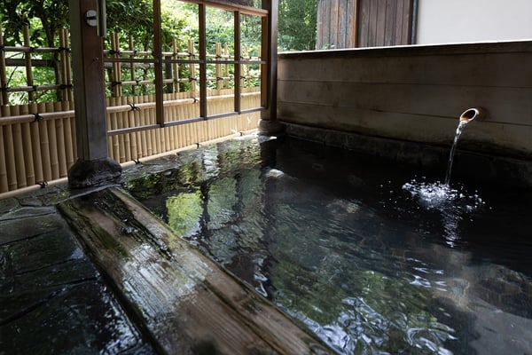 泉質は、カルシウム・ナトリウムー硫酸塩泉で、疲労回復や冷え性、美肌や保湿効果も期待されています。やや広めの貸切風呂「山なみの湯」(要予約・有料)は、静かな山の景色を眺めながらゆったり浸かれるので、プライベート温泉を満喫しましょう。