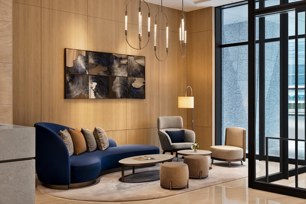 館内は、「Feel the sense of place(その土地の個性を感じる)をコンセプトに、富山の豊かな自然(立山連峰、富山湾)と工芸文化をインテリアに反映。伝統工芸である「組子細工」をモチーフにした木目のぬくもりと、現代的な洗練が融合した空間が広がります。チェックインの際に手渡される、温かい特製のチョコチップクッキーは、全世界共通のダブルツリーbyヒルトンブランドならではのおもてなしです。