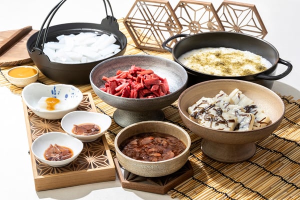 ホタルイカの沖漬け、あんばやし、昆布かまぼこ、黒とろろ昆布入りおかゆなど富山の食材をご用意