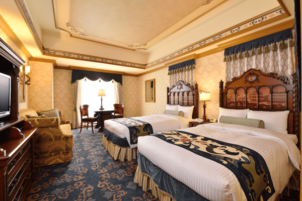 2泊目は、東京ディズニーシー・ホテルミラコスタ。 イタリアンクラシックをコンセプトにした上質な空間で、パークでの冒険を振り返り、明日への航海に想いを馳せることができます。 中でもヴェネツィア・サイド スーペリアルームは、東京ディズニーシーの運河の街「パラッツォ・カナル」やホテルのスパ&プール「テルメ・ヴェネツィア」側に位置しており、ロマンティックな雰囲気をお楽しみいただけます。客室にはレギュラーベッド2台に加えて、ベッドの下に収納されている引き出し式のトランドルベッドが常設されており、最大3名と添い寝2名まで宿泊可能です。トランドルベッドは通常のベッドより高さが低いため、小さなお子さまにも安心してご利用いただけます。室内はイタリアンクラシックの優雅な装飾が施されており、お持ち帰り可能なエコバッグやオリジナルアメニティ、冷蔵庫には無料のミネラルウォーターが完備されています。ドライヤーやヘアブラシ、歯ブラシなどの基本アメニティも充実しており、客室のテレビからルームサービスの注文も可能です。記念のポストカードも用意されているため、特別な滞在の思い出を大切な人に送ることもできます。