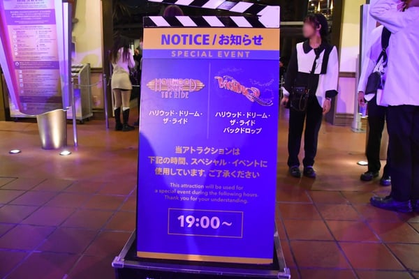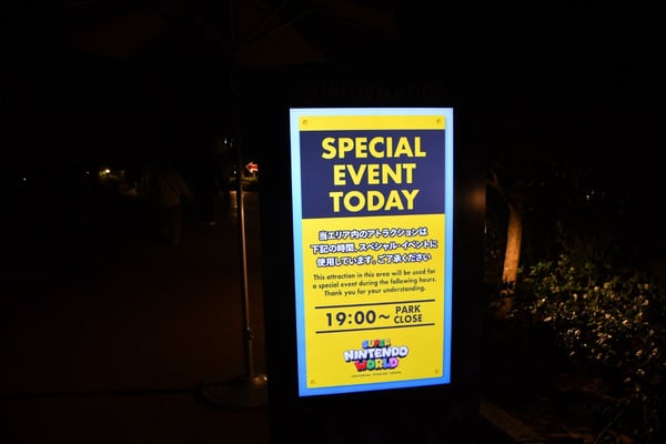 プレミアムナイト開催中はパーク内のいたるところに特別営業を示す案内が。USJを独占しているかのようでテンションが上がります。