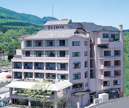 伊香保温泉の情景が露天風呂や客室から眺められる地上6階建ての「旅館さくらい」
