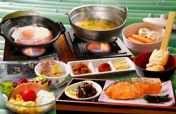 朝食は焼魚や豆腐、お新香、野菜・きのこ汁、焼き魚など、旬を彩る季節の食材を使用した料理が膳に並びます。からだにやさしい和朝食で1日をスタートしましょう。