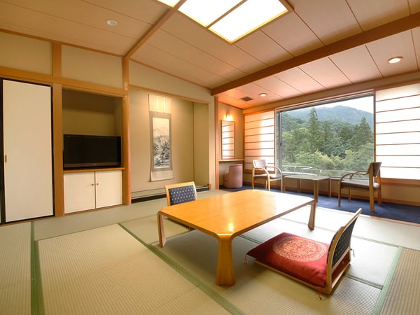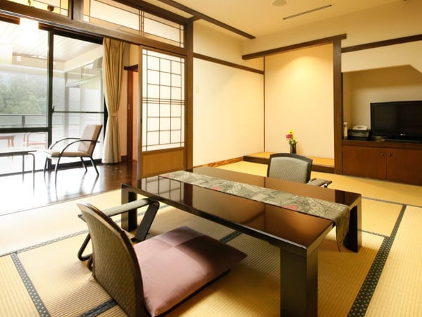 そして、小さな子ども連れのファミリーや三世代旅行には、「スタンダードルーム」が最適です。 10畳と12.5畳のオーソドックスな和室は、靴を脱いで畳の上で手足を伸ばせる安心感が魅力。ハイハイをする赤ちゃんがいても気兼ねなく過ごせます。広縁の椅子に座れば、窓枠いっぱいに広がるのは新緑や紅葉のパノラマ。夜には川の字に布団を並べ、川音を子守唄に眠る体験は、家族の記憶にも温かく残るでしょう。