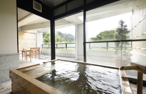 まず、夫婦の記念日などで宿泊してみたいのが、渓流に面した源泉かけ流し風呂付客室「プレミアム和室」です。 8畳から10畳と4.5畳のゆとりある琉球畳の和室に、広縁と半露天のヒノキ風呂が備えられ、眼下を流れる久慈川の瀬音と、心地よい風を肌に感じながら、24時間好きな時にふたりだけの湯浴みが楽しめます。