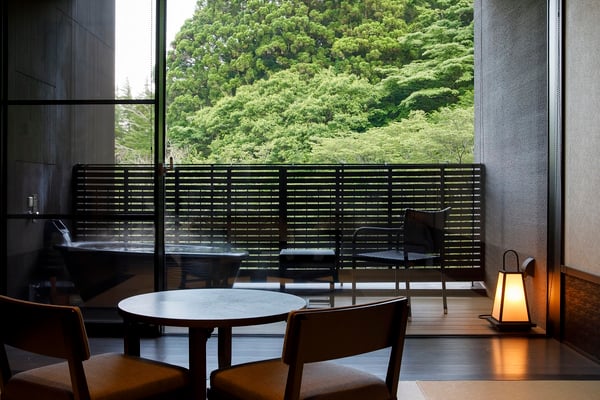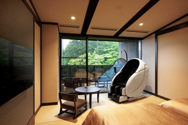 「最上階客室」は、高い天井と広い窓が開放感を演出。バルコニー越しに箱根外輪山を望み、爽やかな朝はハンギングチェアに揺られながらカラダを目覚めさせ、夜は星空を眺めながらゆっくり展望風呂でプライベートな湯浴みの時間を。