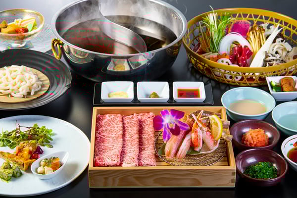2階のしゃぶしゃぶでは、和牛ロースと本ズワイガニの付けと足の肉を贅沢に使った豪華盛り合わせコースが人気。どちらも、大切な人とのアニバーサリーにおすすめです。