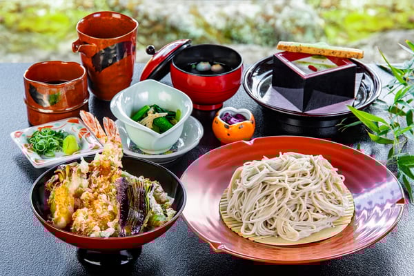 また、1918年(大正7年)に藤田平太郎男爵の別荘として建てられ国登録有形文化財建造物に指定されている「蕎麦 貴賓館」は、ランチメニューのみ。こだわりのそば粉を使い、箱根の澄んだ水で洗ったそばは、のど越しがよく風味豊かな味わいが特徴。天丼や鴨鍋、ウナギまぶし飯などと組み合わせた多彩なそば御膳があるので、緑が美しい庭園を眺めながらゆっくり味わいましょう。
