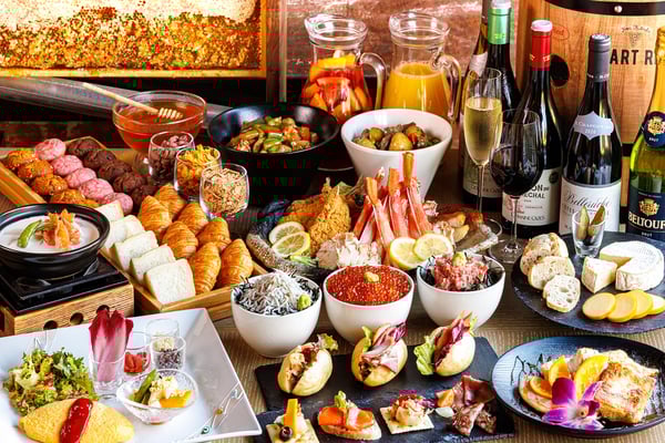 和洋50種類以上の料理は、盛り付けは色鮮やかで、インスタ映えを狙うシャッターチャンス。贅沢なメニューの中から好みに合わせてコース料理のように美食の数々をアレンジして楽しめるのが大きな魅力です。