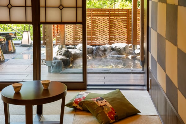 2~8階にある客室数が最も多い露天風呂付「標準客室」は、足が伸ばせるフラットな空間にベッドや座椅子などをレイアウトした和洋折衷のスタイル。窓からは渓谷の緑や外輪山の稜線が広がり、展望風呂で温泉に浸かれば、四季折々の自然が旅を彩ります。