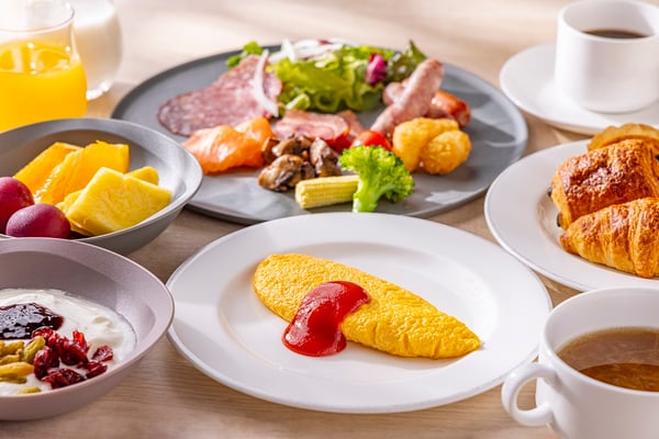 朝食はブラッセリー「フローラ」での和洋ビュッフェ。王道の卵料理、ベーコン、ソーセージや 焼き立てクロワッサンやベーカリー 、小田原おでんやかまぼこ、干物といった小田原の名産物や、海鮮やお好みの具材をごはんにトッピングする海鮮丼など、地元食材を使った料理が味わえます。