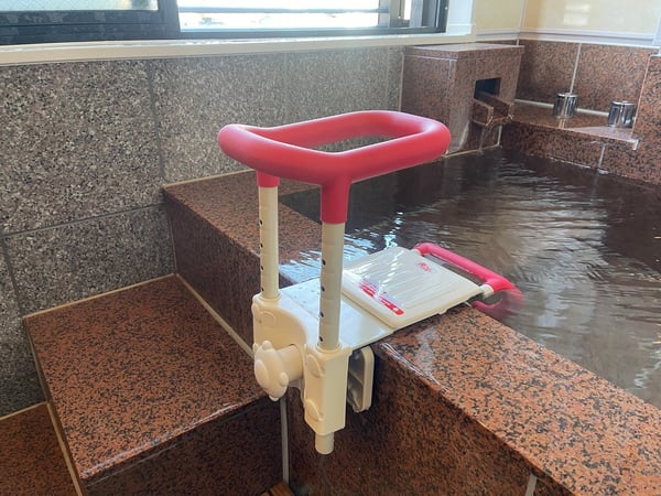 内風呂は湯船のへりが幅広く設計されているので、車いすユーザーもいったん、このへりに腰かけてから温泉に入ることができます。
