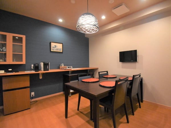 和洋室とプライベートダイニングルームがあり、源泉が注がれる内湯が付く、58㎡の広いお部屋です。