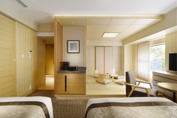 5階にあるジャパニーズスイート(和洋室)は、畳や障子、床の間など和の佇まいと、ベッドやリビングチェアなどモダンで機能的な要素がシームレスにつながるユニークな客室。最大6名まで宿泊できるので、ゆったり足を伸ばして会話に華を咲かせる女子旅や、小さな子ども連れや2世代の家族旅行に最適です。