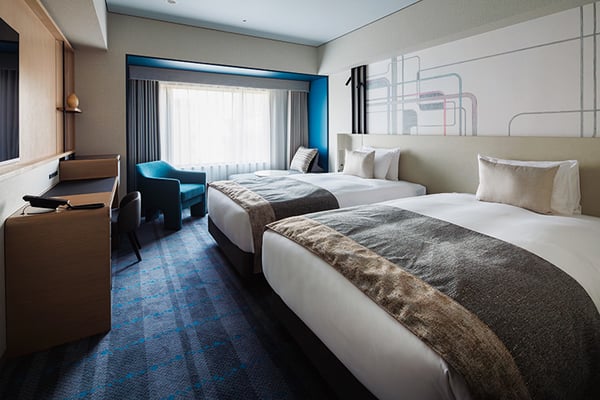 5階から15階にあるスタンダードは、シングル、ツイン、クイーンなど10タイプの客室があります。なかでも、2024年3月にリニューアルされたモデレートルームは5タイプが揃い、ホテルのシンボルカラーである「ジェイドブルー」を基調とした設え。快適な明るさが調整できるスポット照明と間接照明、廃材を活用したアートやカーペット、大きなスーツケースが広げやすいレイアウトなど、快適性とサスティナブルを強く意識した新しいスタンダートといえる客室です。