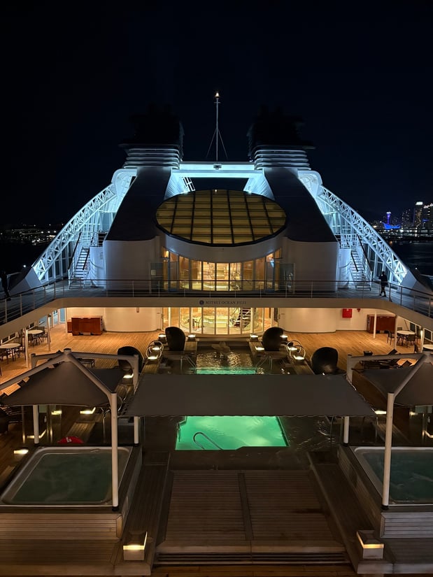 クルーズ客船に欠かせないプールでは、デッキチェアに佇んでのんびり過ごすのがおすすめ。非日常空間であっても、オンとオフを切り換えて自分のペースで楽しむのが1番ですね。