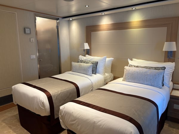 「MITSUI OCEAN FUJI」の客室は、全室がスイート仕様、海側に面したスイートキャビンをそろえたラグジュアリークラスのクルーズ客船です。すべての客室はリビングとベッドルームが仕切られた過ごしやすい空間で、バスタブ・洗浄機能付きトイレ・ウォークインクローゼットを完備。