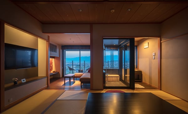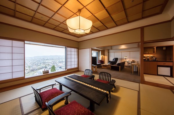 東の館「蒼昊」にはほかにも、113㎡の広さに和室と応接間、2つのベッドルームがある温泉展望露天風呂付きの「最上階貴賓室」があり、最大定員が8名なので3世代家族に最適。応接間と12.5畳の和室に設置した特別なパノラマワイドの窓から望む景色は昼も夜も圧巻です。ヒノキで設えた温泉展望露天風呂も広々としていて、ゆったりくつろげます。