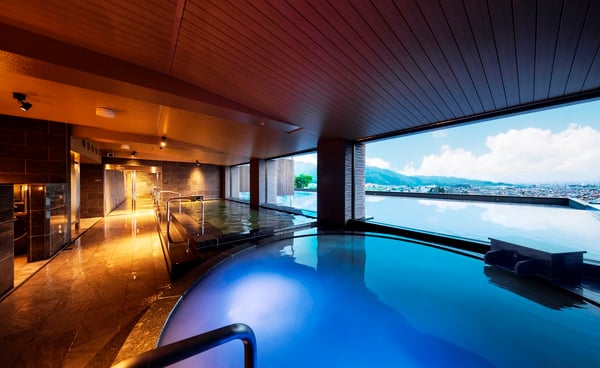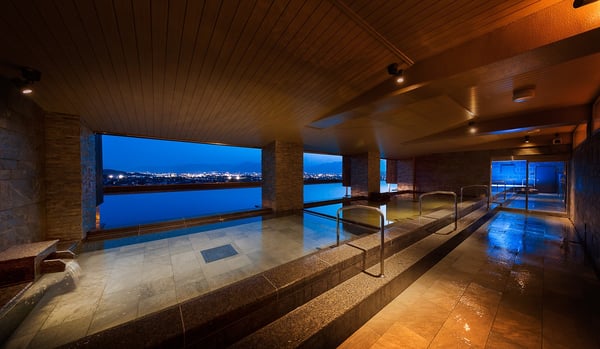 「束間の湯(せんまのゆ)」では、移ろう四季を感じながら昔ながらの温泉風情が楽しめる庭園露天風呂や露天ジャグジーがあり、夕食の前後に湯に浸かれば美しい夜景を望みながら湯浴みができます。温度差のある2つの湯船と低温サウナを併設した県下最大級の広さを誇る大浴場(内湯)もあるので、屋内外を行き来しながら温泉を楽しみたいですね。