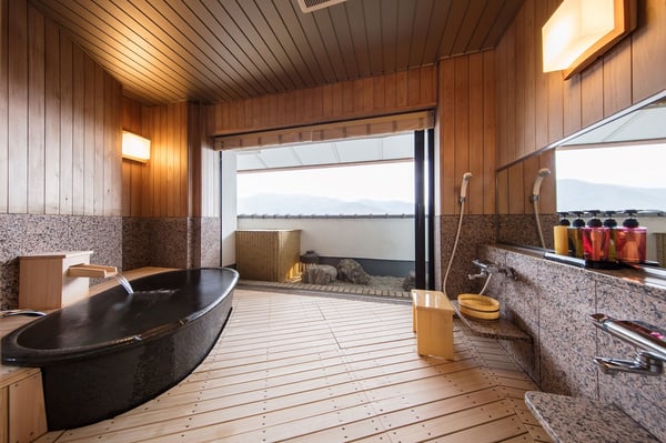 ヒノキが香る空間に陶器の浴槽を配置した贅沢な貴賓室の展望露天風呂