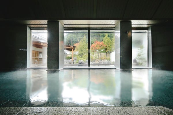 新緑や深緑、紅葉など季節の彩りが窓の向こうに広がる大浴場