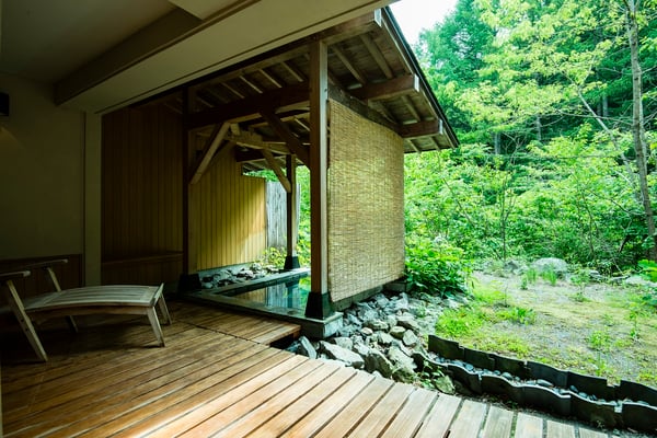 たとえば、「然 白樺」や「然 熊野」には、広々とした室内に加えて大きなテラスに露天風呂を備え、四季折々の自然を間近に時の流れに身を委ねてゆったり過ごすことができます。展望風呂の「然 湯治」、半露天風呂の「然 笹」や「然 滝」、「然 Standard」は、和洋を織り交ぜた異なる趣の設えで個性を放ち、額縁のように切り取られた窓からは四季折々の自然が絵画のように広がります。