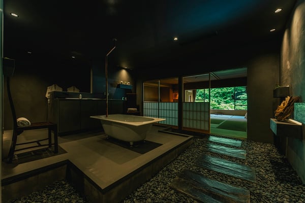 また、2021年に「然シリーズ」に加わった「然SPA Living」は、温泉に浸かれる浴槽がリビングの中央にあり、壁に展示された苔アートや流木作品を眺めながら瞑想の入浴ができるユニークな客室。