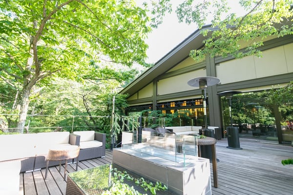 「信州 ダイニングTOBIRA」では、約80ある信州の伝統野菜をはじめ、信州食材を引き立たせる日本各地の山海の幸を斬新な趣向で盛り込んだモダンな日本料理が味わえます。白樺をモチーフにした照明と和紙ランプが森の自然と調和する店内のほかに53㎡の屋根が付いたテラス席もあり、ライトアップされた木々や星空を眺めながら料理が楽しめます。