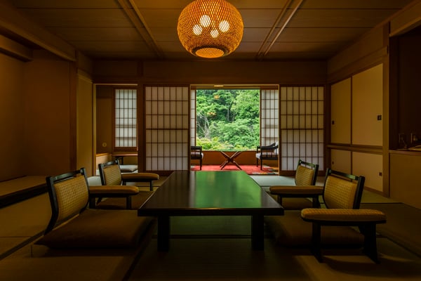 「扉温泉 明神館」の客室は、2019年と2021年のリニューアルで誕生した「然(ぜん)シリーズ」7タイプと、既存の5タイプを合わせた全39室。“然”は「ありのまま」を意味し、その名の通り、自然と調和しながら本来の自分に立ち返るような滞在体験を提供してくれます。旅館という枠を超えた、深い静けさと解放感が魅力です。