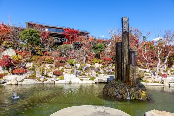 桜と紅葉を愛でる回廊の先には富士山・河口湖・庭園を一望する「ふじさんデッキ」が
