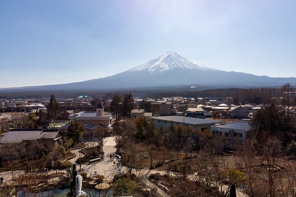 続いて「新倉富士浅間神社」へ。398段の石段を上った先にある新倉山浅間公園の展望デッキからの眺めは、まさに息を呑む美しさ。五重塔(忠霊塔)、左右対称の富士山、そして眼下に広がる富士吉田の街並みが広がる光景は、海外からも注目される日本の象徴的な風景です。春の桜だけでなく、季節ごとに表情を変えるので、河口湖へ来たらぜひ訪ねてください。
