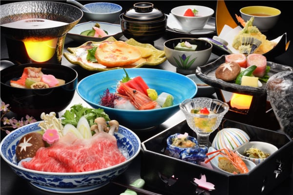 三陸の鮮魚や仙台牛など、地元の厳選素材が美しく盛り付けられた夕食(イメージ)