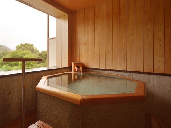 心地よい風を感じながらゆったりと湯船に浸かれる客室の半露天風呂