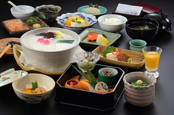朝食もまた、1日のはじまりを幸福感で満たしてくれるメニューを、本館は個室料亭「羽衣」の清々しい空気の中で、離れの方は変わらずお部屋で味わえます。「茶寮宗園」の名物料理である豆乳仕立ての湯豆腐に、ふっくらと炊き上げられた宮城県産の白米。そこへ、出汁の香りが立つ熱々の味噌汁や、旬の素材を用いた小鉢、焼き魚などが並ぶ「和定食」が用意されます。