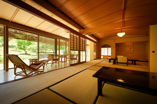 「茶寮宗園」の客室に足を踏み入れた瞬間、誰もが感じるのは圧倒的な静けさと懐かしさです。離れと本館の1・2階に分かれた全26室という限られた客室数は、8,000坪の広大な敷地に対して驚くほど贅沢な配置。