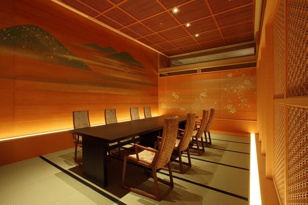一方、本館に宿泊ゲストが案内されるのは、日本の伝統的な意匠が施された本館2階にある個室料亭「羽衣」です。全席が個室となっているため、まわりの視線を感じることなく、落ち着いた雰囲気の中で食事を楽しむことが可能です。
