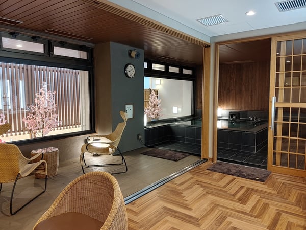 加えて、「貸切風呂 桜」を新設したのは2024年。定員4名ですが、中規模の宿の大浴場ほどの浴場の広さで、湯船の縁まで車いすで入っていけます。ゆったりとした脱衣所に、湯船の横の寛げるスペースにはチェアーも設置されています。